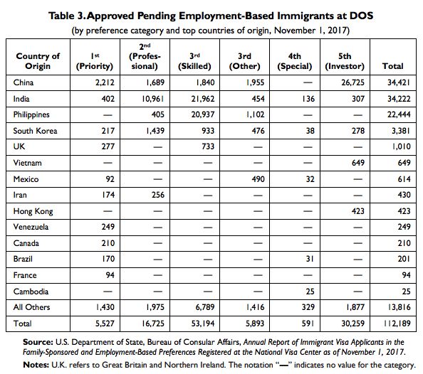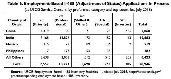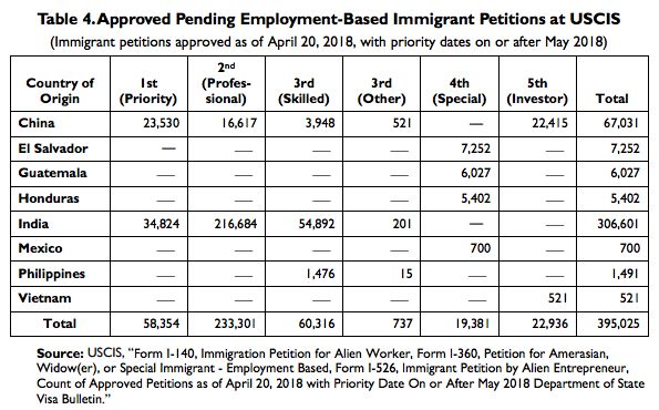从移民局批准的I-485身份转换申请数量来看,截止到2018年4月20日批准的395,025份申请中,306,601份、78%均来自于印度申请人,中国申请人以67,031份17%的数量排名第二,印度加中国两国申请人占到总量的95%。