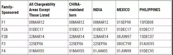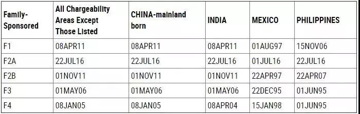 根据亲属移民排期表B,对于中国大陆出生的申请人来说:
