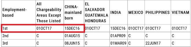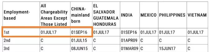 上面是美国国务院签证办公室公布的最近两个月的签证公告牌,EB-1A在中国大陆地区的最终优先日分别是2016年9月1日和2016年12月16日。按此估算,EB-1A的排期时间大概为两年左右。
