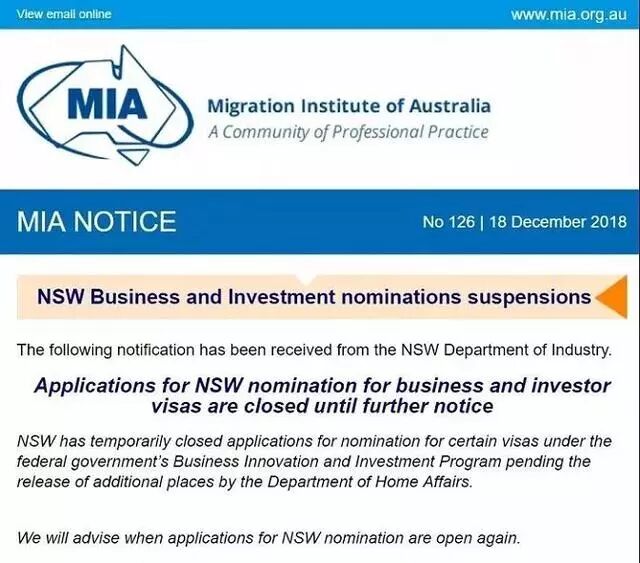 就在上个月18号!澳洲新南威尔士州政府突然通知:暂停所有商业移民申请!包括188A创业投资类、188B投资类、188C重大投资者类和132天才企业家类移民签证州担保申请,堵住了不少澳洲移民者的通往新州之路。