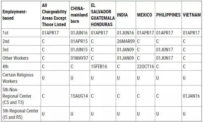 - 值得注意的是,EB-5区域中心申请类别I5和R5显示为“U”(没有名额)。这是因为投资移民区域中心项目即将在2018年9月30日到期。在9月30日之前,I5和R5投资移民签证可正常签发。在9.30之后,将停止签发I5和R5投资移民签证,除非国会在9月30日之前将EB-5再次延期。如果继续延期,那么接下来签证公告板将会显示为有名额(中国大陆申请人会显示排期截止日期2014年8月15日)。
