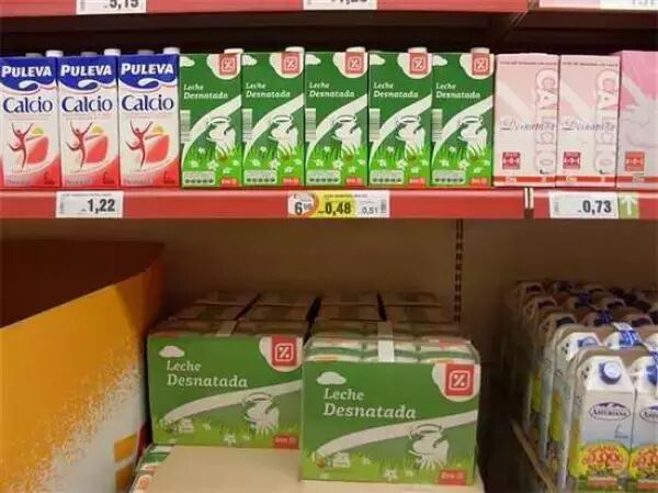 不同超市价格不同。这是家乐福旗下的超市本地牛奶买一包0.51元,买6包一提每包只要0.48欧元。这里绿色装脱脂牛奶。各超市牛奶和包装颜色不完全统一。1.22欧元的是加钙加维生素D的牛奶。