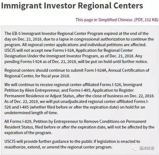 自2018年12月21日起,移民局不接受新的 I-924申请,已递交尚未批准的I-924申请将暂停审理。