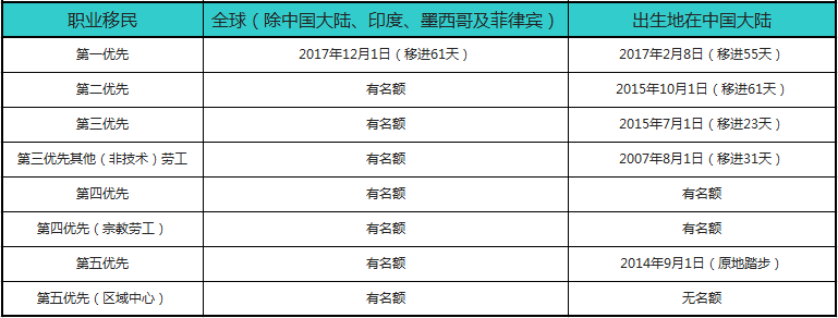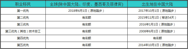 职业移民递件排期上,港澳台除了第一优先排期仍然是2018年6月1日外、原地踏步,其余类别都有名额;大陆申请人除了第二优先移进54天、至2015年11月1日外,其余内容无变化。