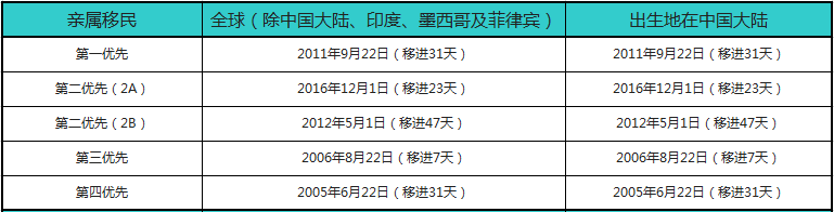 亲属移民的“绿卡最后批准排期”(Application Final Action Dates,简称“绿卡批准排期”),港澳台及中国大陆出生申请人的具体更动情形如下:
