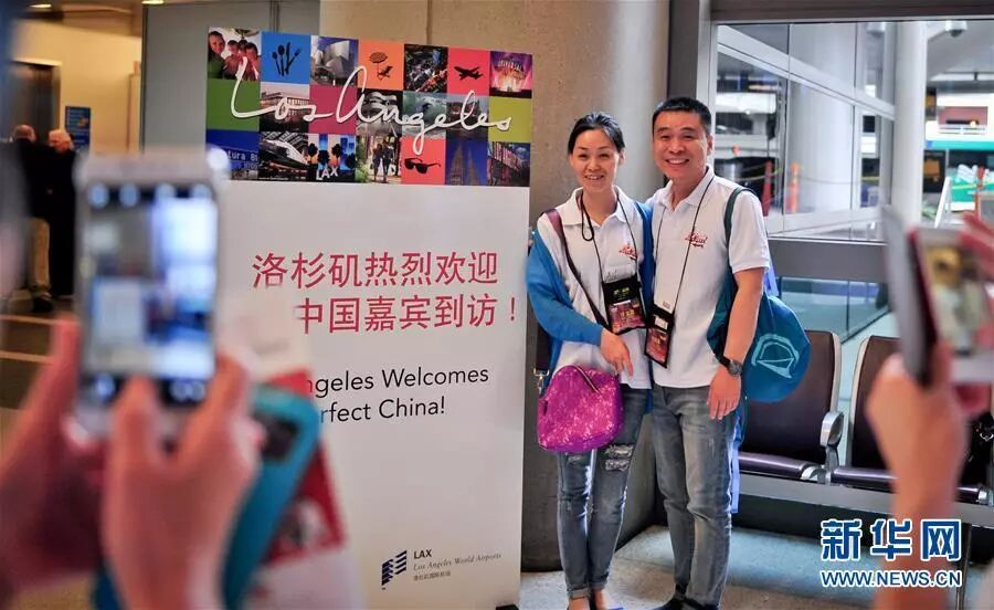▲资料图片:2014年5月22日,在美国洛杉矶国际机场,两名旅游团成员与洛杉矶会议及旅游局打出的欢迎标语牌合影留念。(新华社)